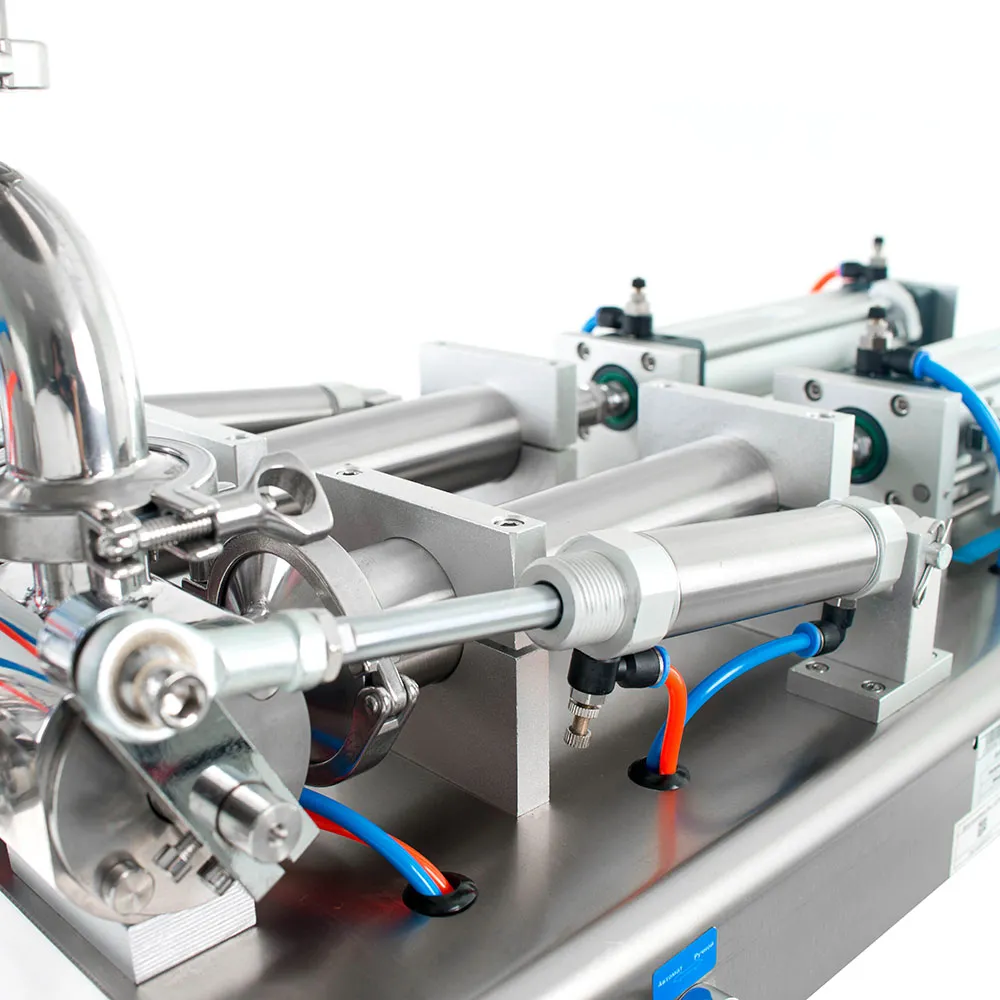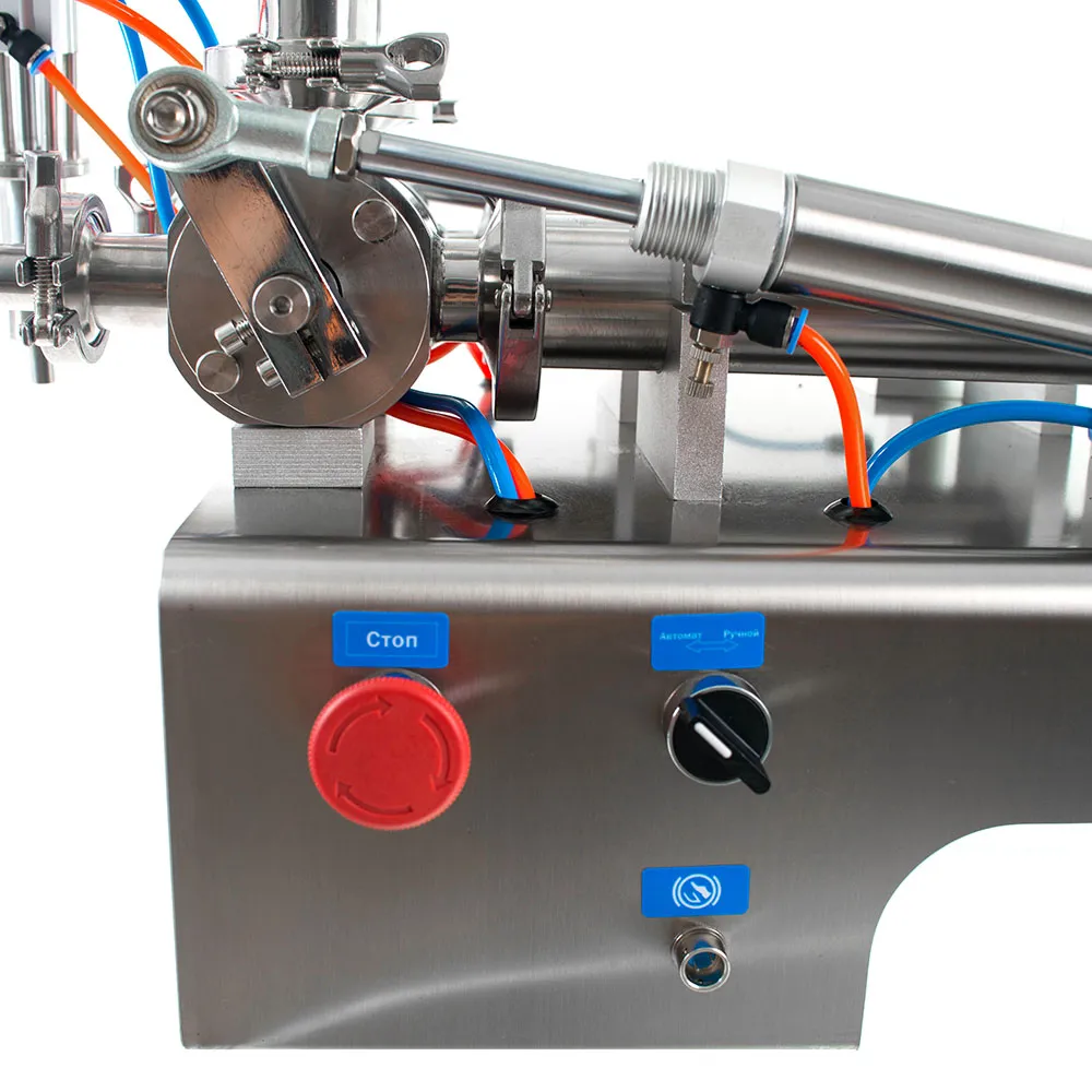 - Поршневой механизм приводится в движение пневмоцилиндром, трёхходовой поворотный клапан управляет потоком продукта. Датчики холла контролируют положение поршней, обеспечивая повторяемость каждого цикла.