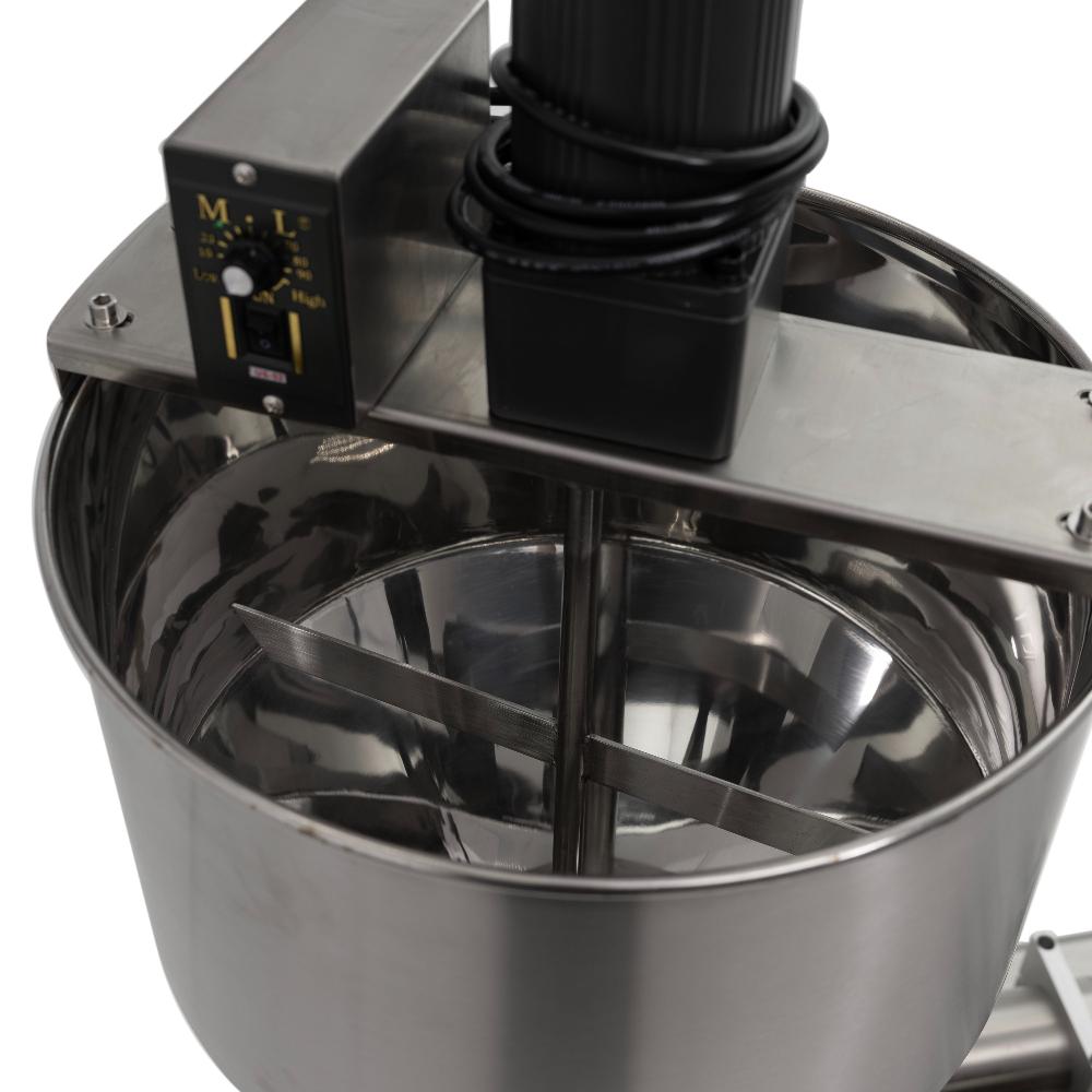- Встроенная система перемешивания. Месильный орган с отдельным приводом постоянно перемешивает продукт в бункере, предотвращая образование комков, осадка и расслоение, что особенно важно для вязких и нестабильных составов.