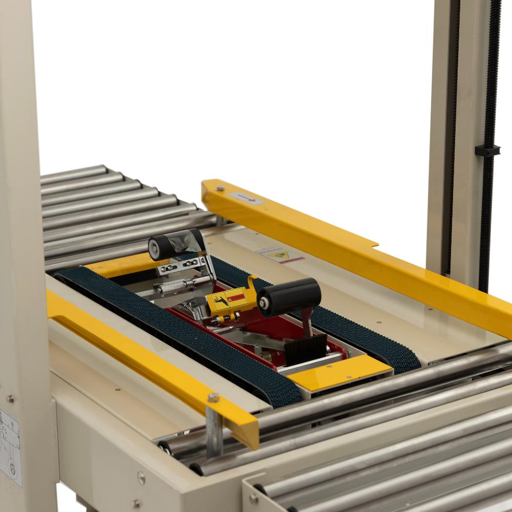 - Двухпоясная система протяжки. Верхние и нижние конвейерные ремни работают синхронно, обеспечивая стабильное движение даже тяжелых коробов (нагрузка до 20 кг). Исключается застревание и смещение ленты в процессе заклейки.
