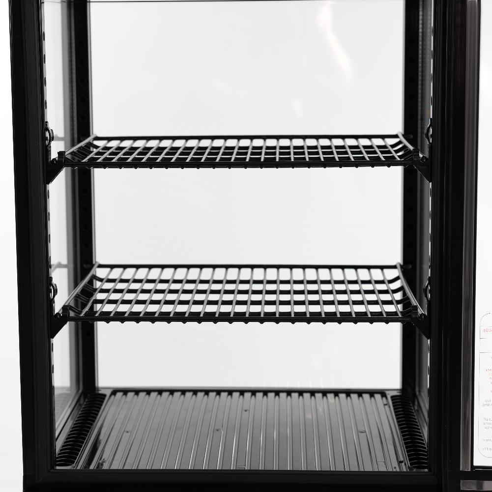 Компактная витрина устанавливается на столе или другой ровной поверхности. Габариты витрины составляют 428*386*810 мм, а объем камеры – до 58 литров. Конструкция подразумевает установку дополнительных полок или противней, чтобы увеличить полезное пространство. Металлический корпус не требует особого ухода. С поверхности легко удаляются загрязнения влажной салфеткой.