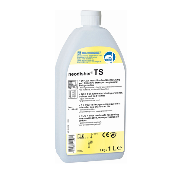 - специальный ополаскивающий агент в концентрированном виде.Смачивает металлические и фаянсовые поверхности и поверхности плохо смачиваемых пластиков. Остатки щелочи и щелочных растворов смываются и нейтрализуются органическими кислотами, составляющими neodisher TS.