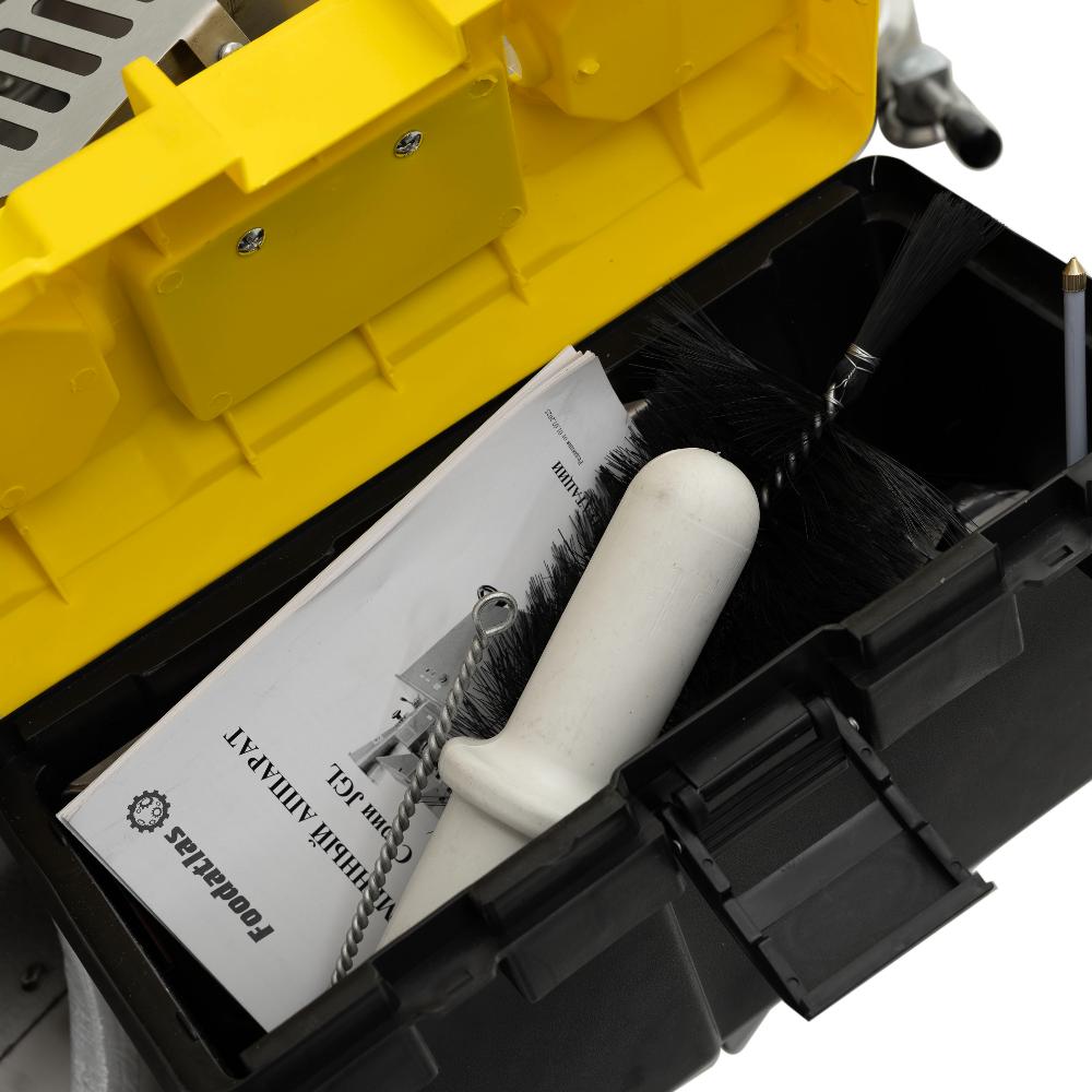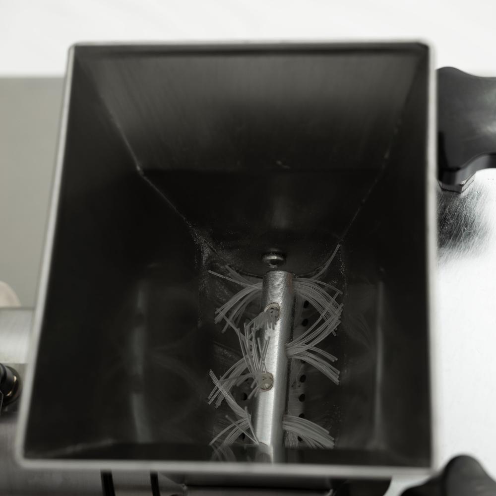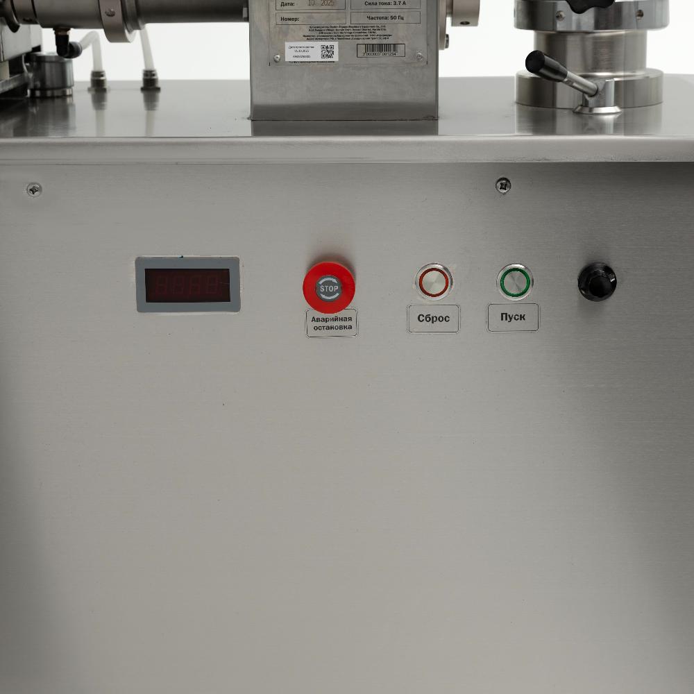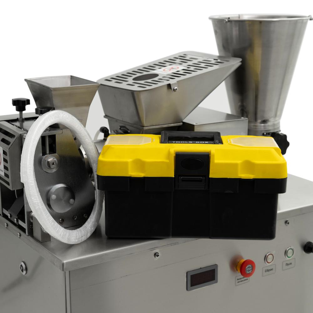 - Гигиеничная и безопасная конструкция. Все детали, контактирующие с продуктом, выполнены из нержавеющей стали. Электрощит закрывается на ключ, исключая доступ посторонних, а защитные решётки на бункерах предотвращают травмы.