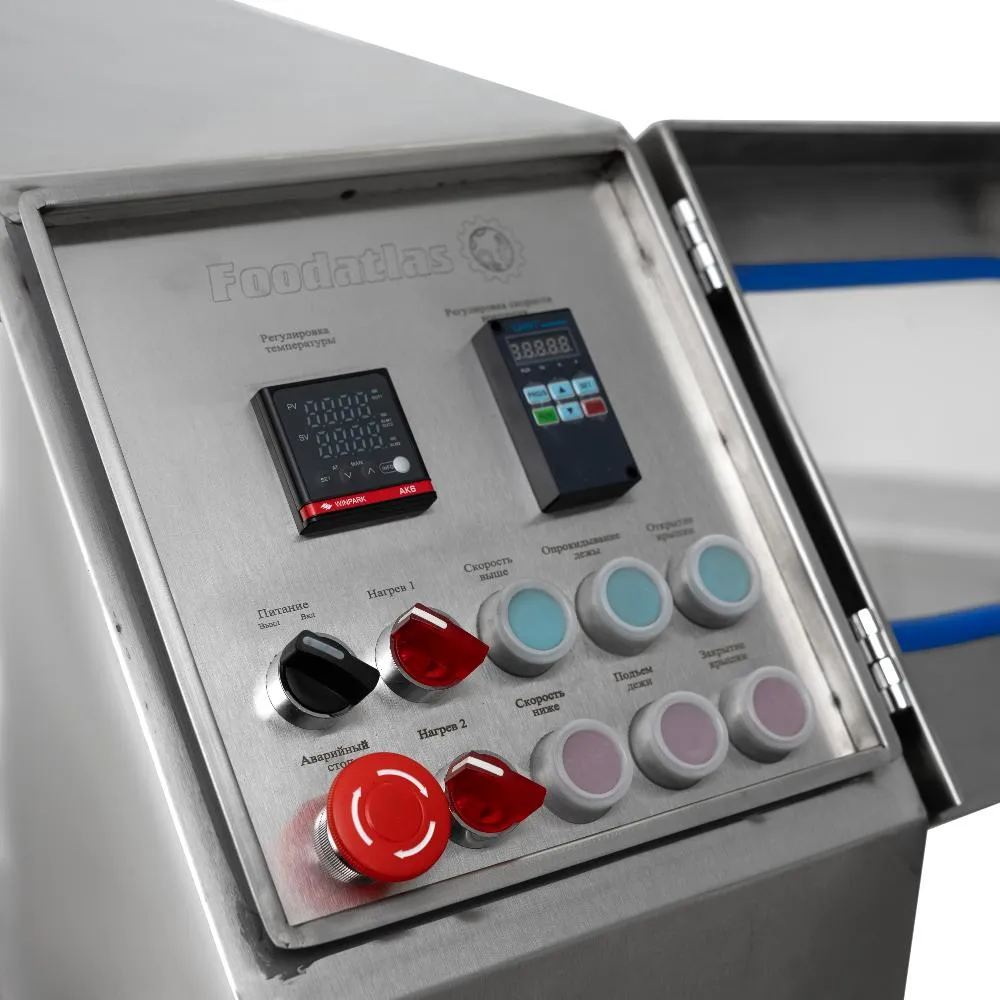- Кнопки управления гидравликой/электроприводом (открытие/закрытие крышки на 90°, опрокидывание дежи на 90° для выгрузки);