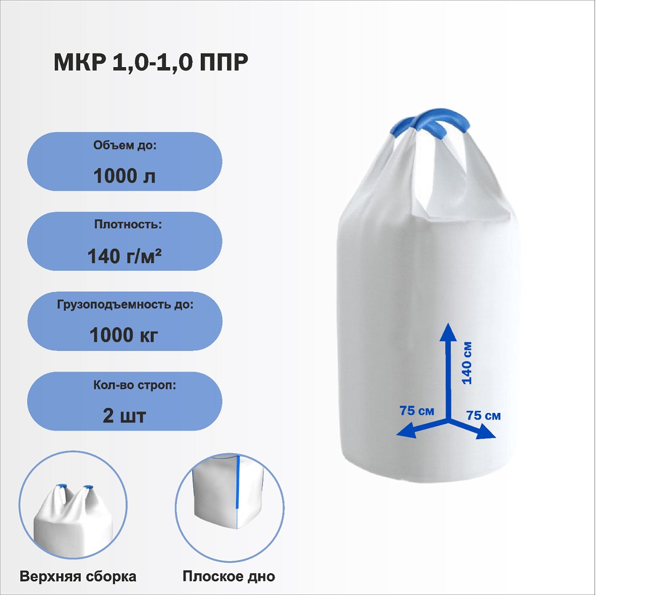 МКР 1,0-1,0 ППР ― мягкий контейнер, применяется для хранения и транспортировки сухих сыпучих материалов. МКР используют в своих логистических схемах перевозки, складирования и хранения сыпучей продукции заводы химической, аграрной, строительной, пищевой, горнодобывающей и других отраслей промышленности. В них фасуются следующие виды продуктов: минеральные удобрения (карбамид, нитроаммофоска, аммиачная селитра и др.), сера, сода, известь, технический углерод, цемент, песок, гипс, гравий, микромрамор, абразивные порошки, гранулы полистирола, полипропилена, полиэтилена, древесные гранулы, сахар, соль, муку, крахмал, зерно и многое другое.