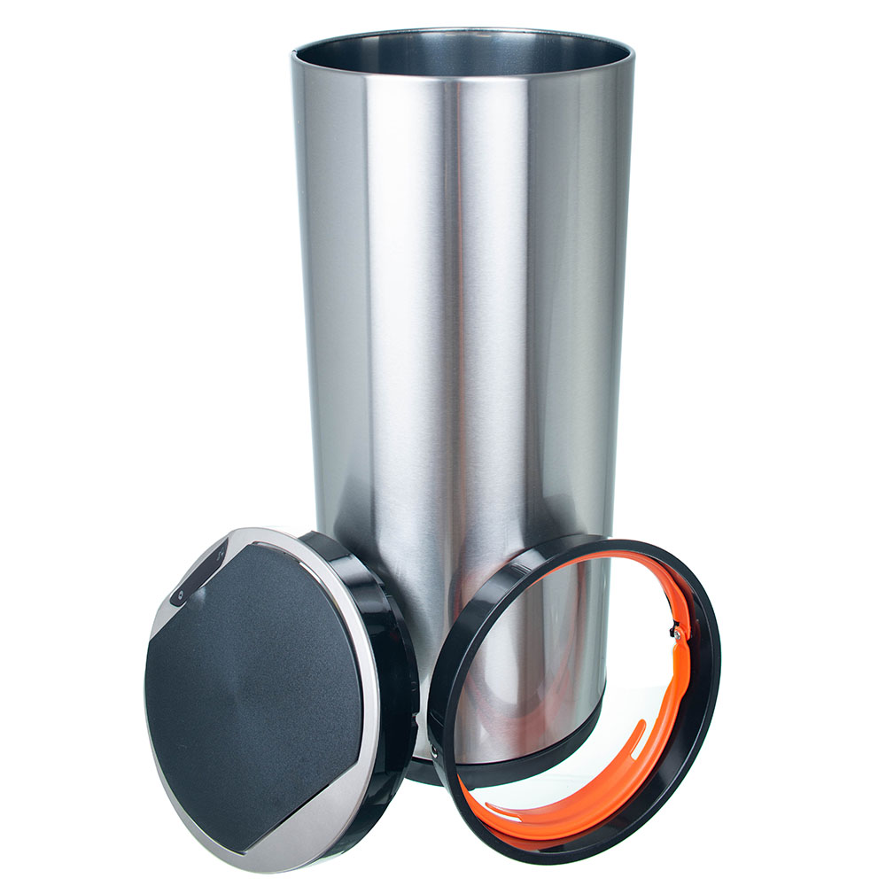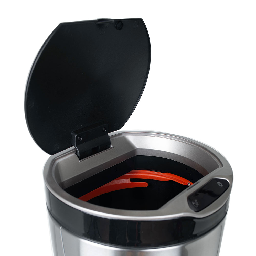 Стальной корпус сочетает в себе долговечность и современный стиль. Благодаря разнообразию объёмов сенсорные вёдра используют не только дома: на кухне, в санузле, в детской комнате; но и в офисах или обеденных зонах компаний, а также в загородных домах и коттеджах. Особенностью данной модели является разнообразие в открытие верхней крышки, которыми возможно воспользоваться в зависимости от ситуации.